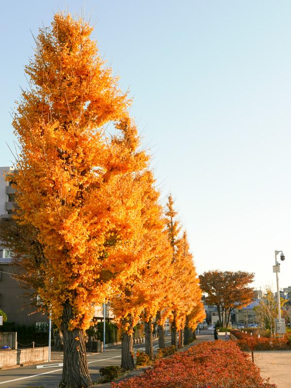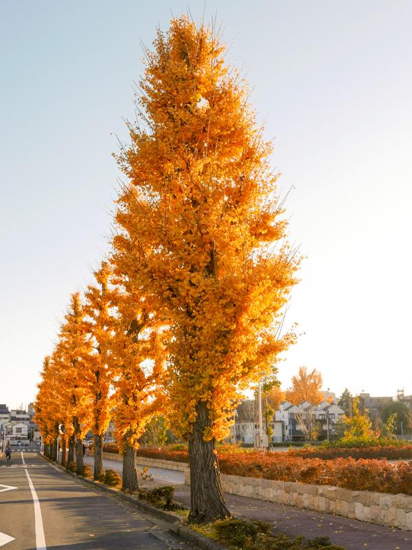 自転車で移動中に、偶然見つけた銀杏並木。夕陽を浴びて、美しく輝いていた。
